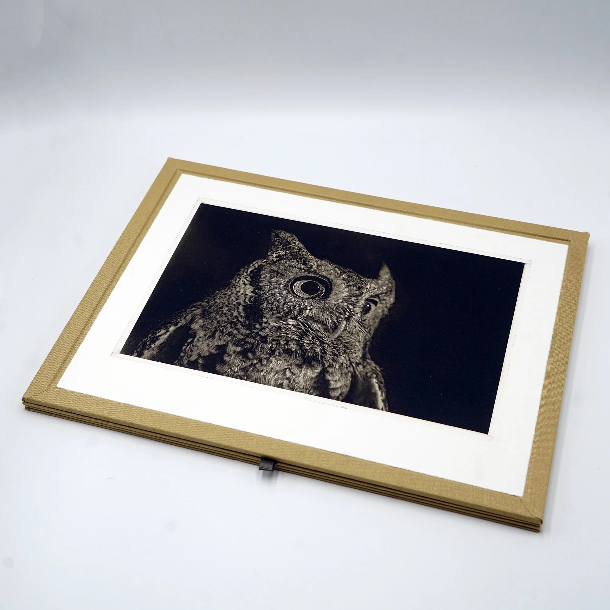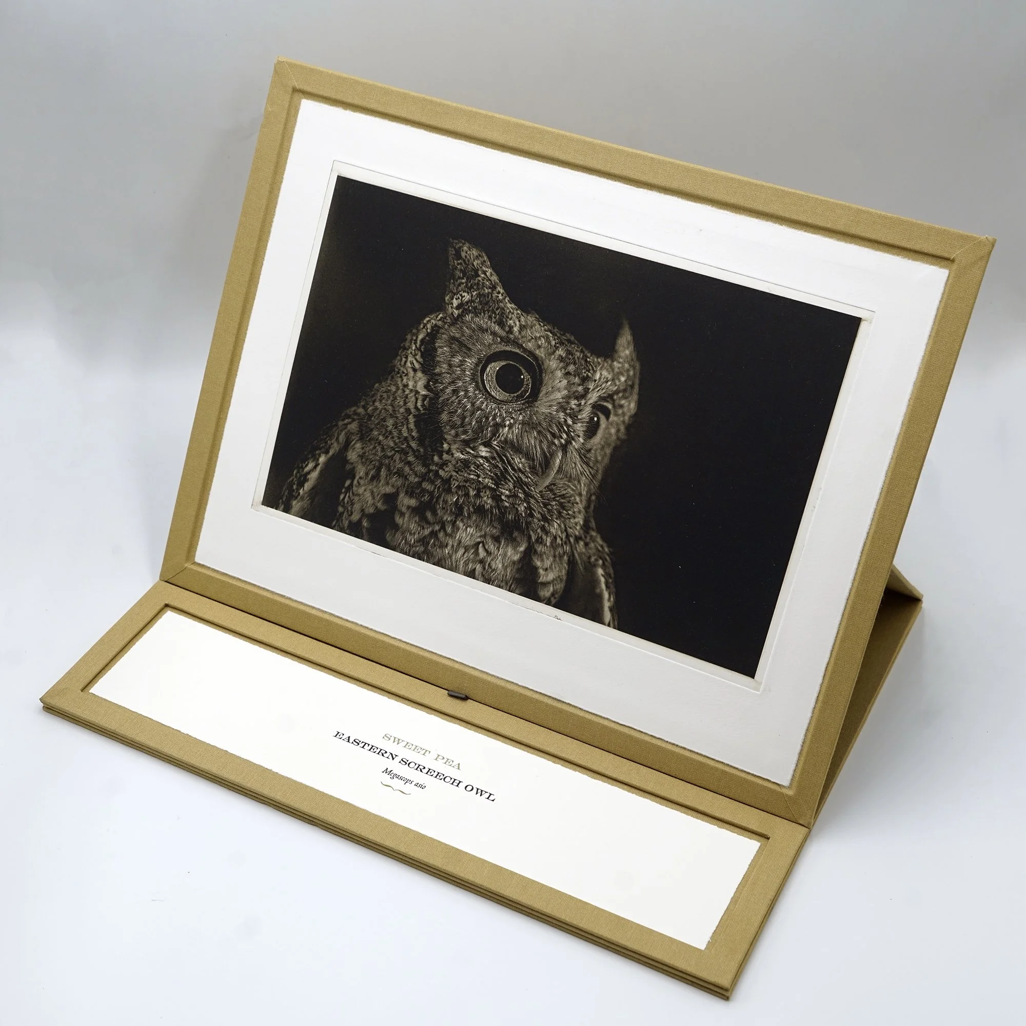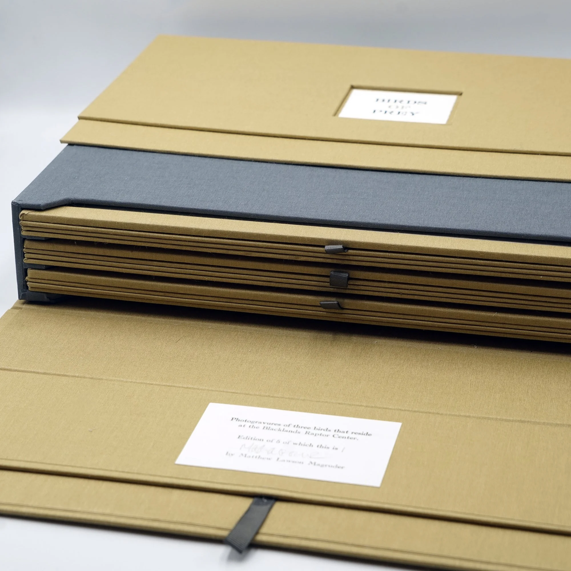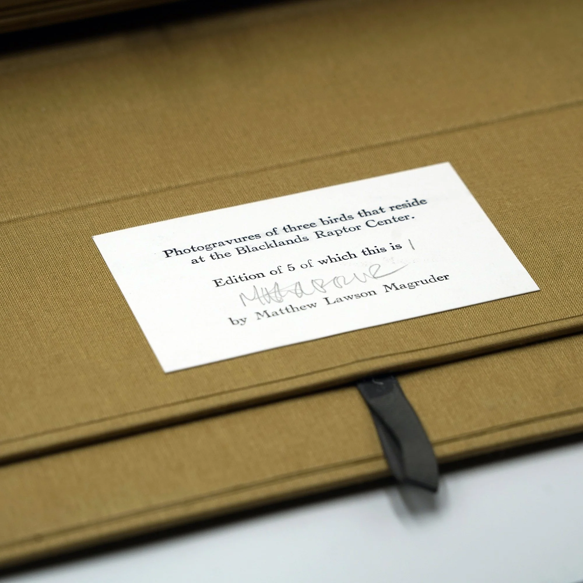 The photographs were taken during a shooting experience of birds of prey that reside at the Blackland Prairie Raptor Center. The project includes three 7x11” Polymer Photogravures on Rives BFK paper. The prints are mounted and presented in a collapsible presentation structure inspired by Sarah Horowitz and Rory Sparks. Each of these are titled with the bird’s name, species common name, and scientific name. These three are then housed in a 3-level slipcase outer structure.