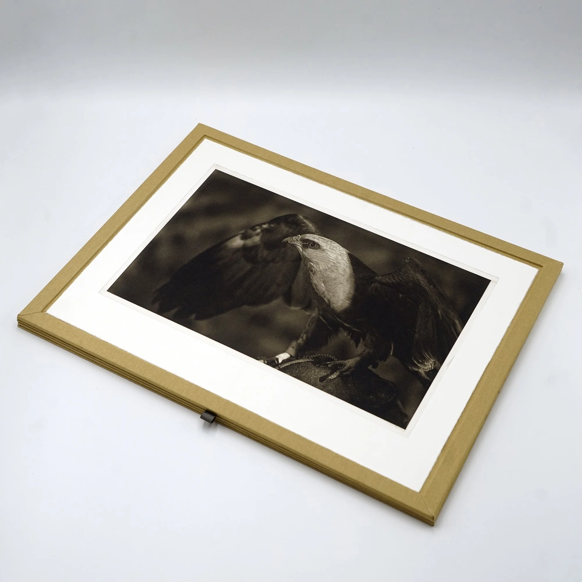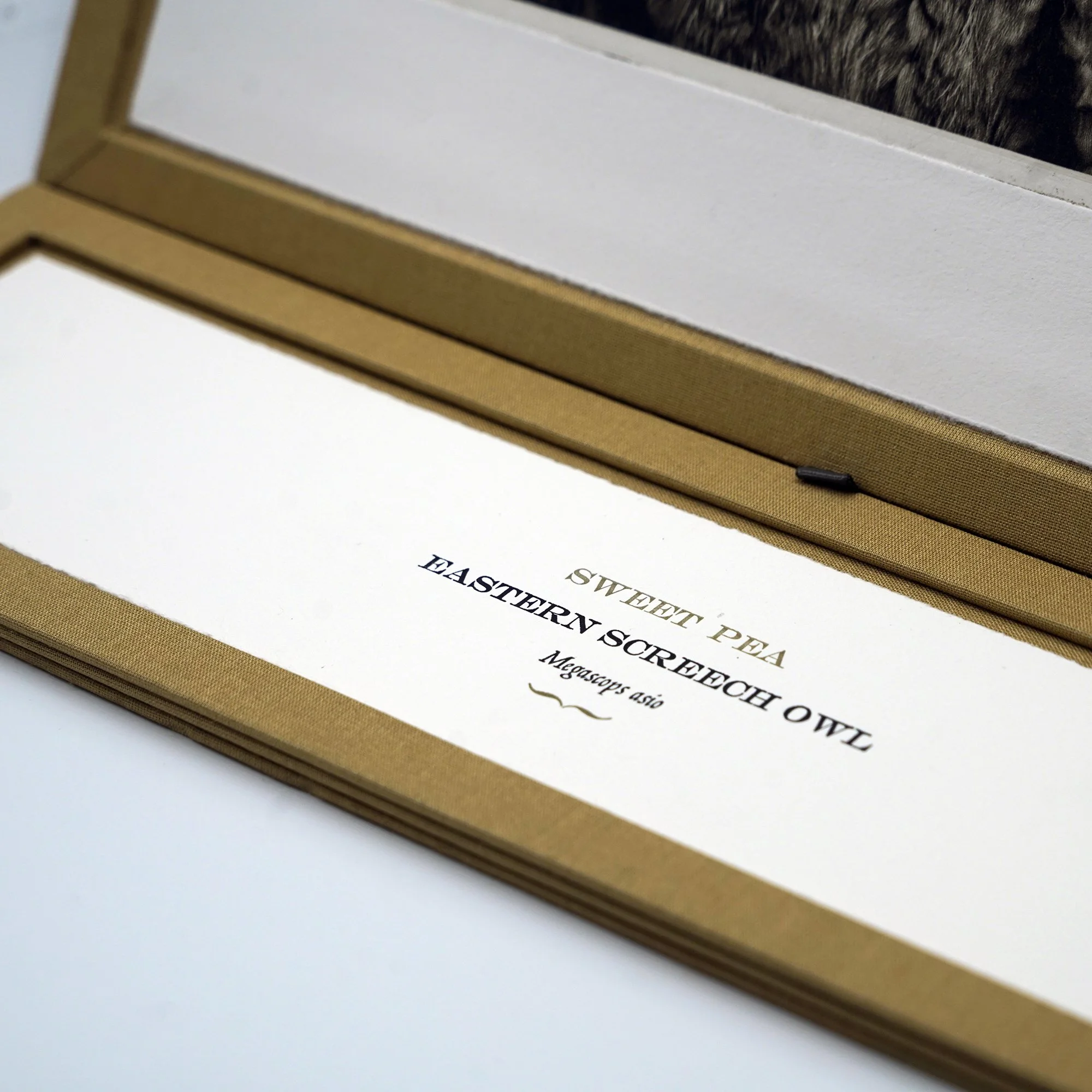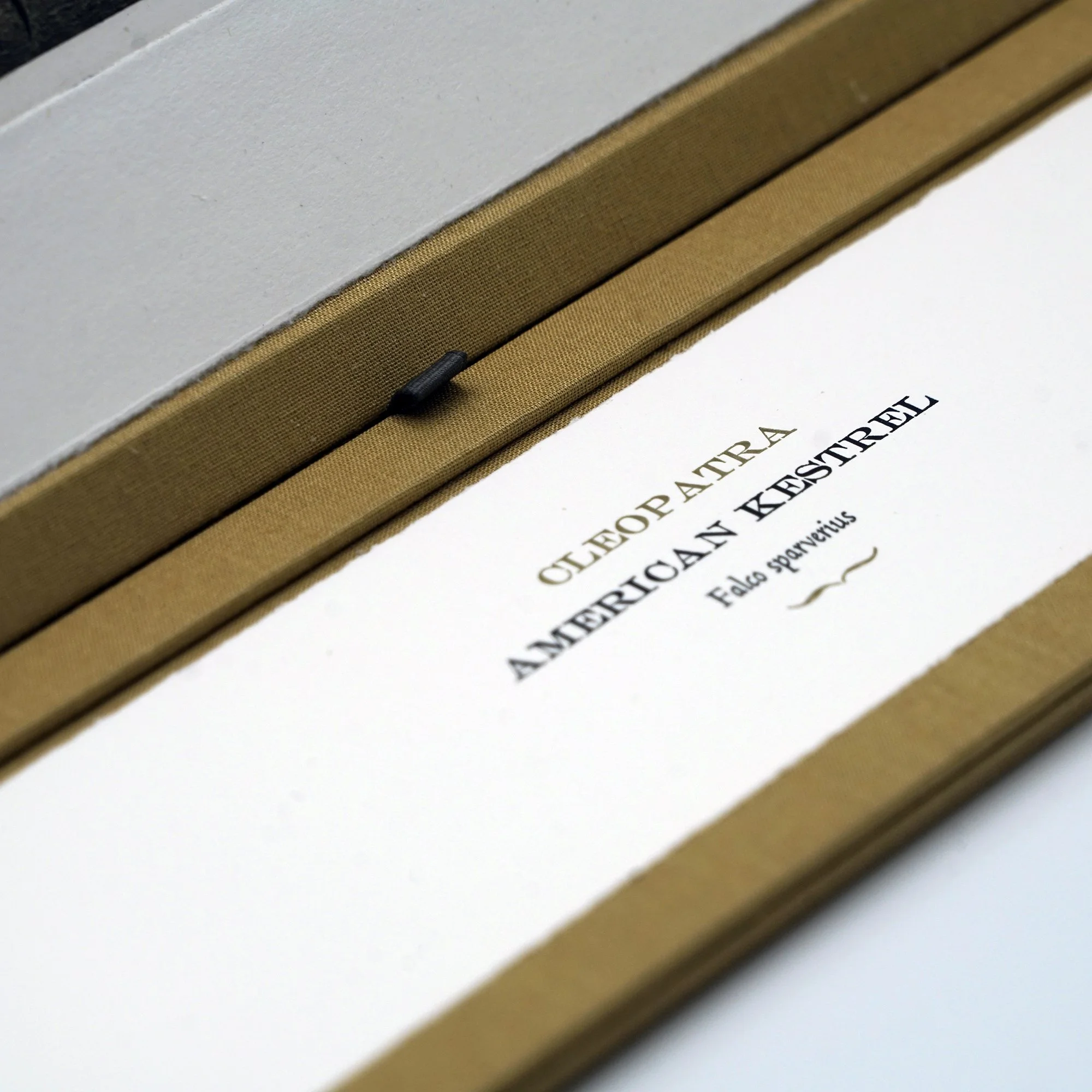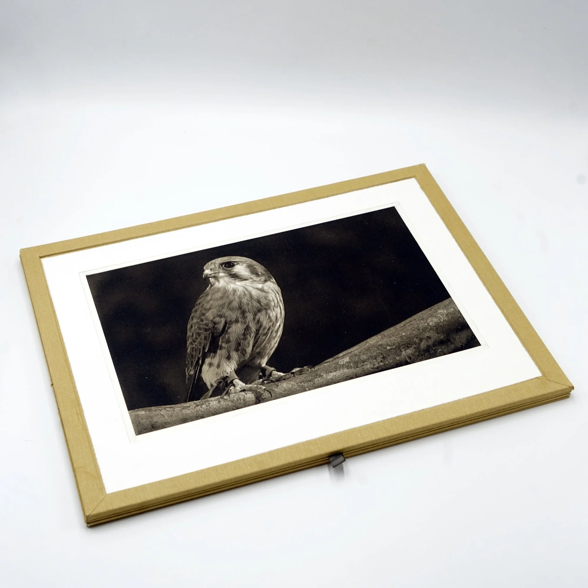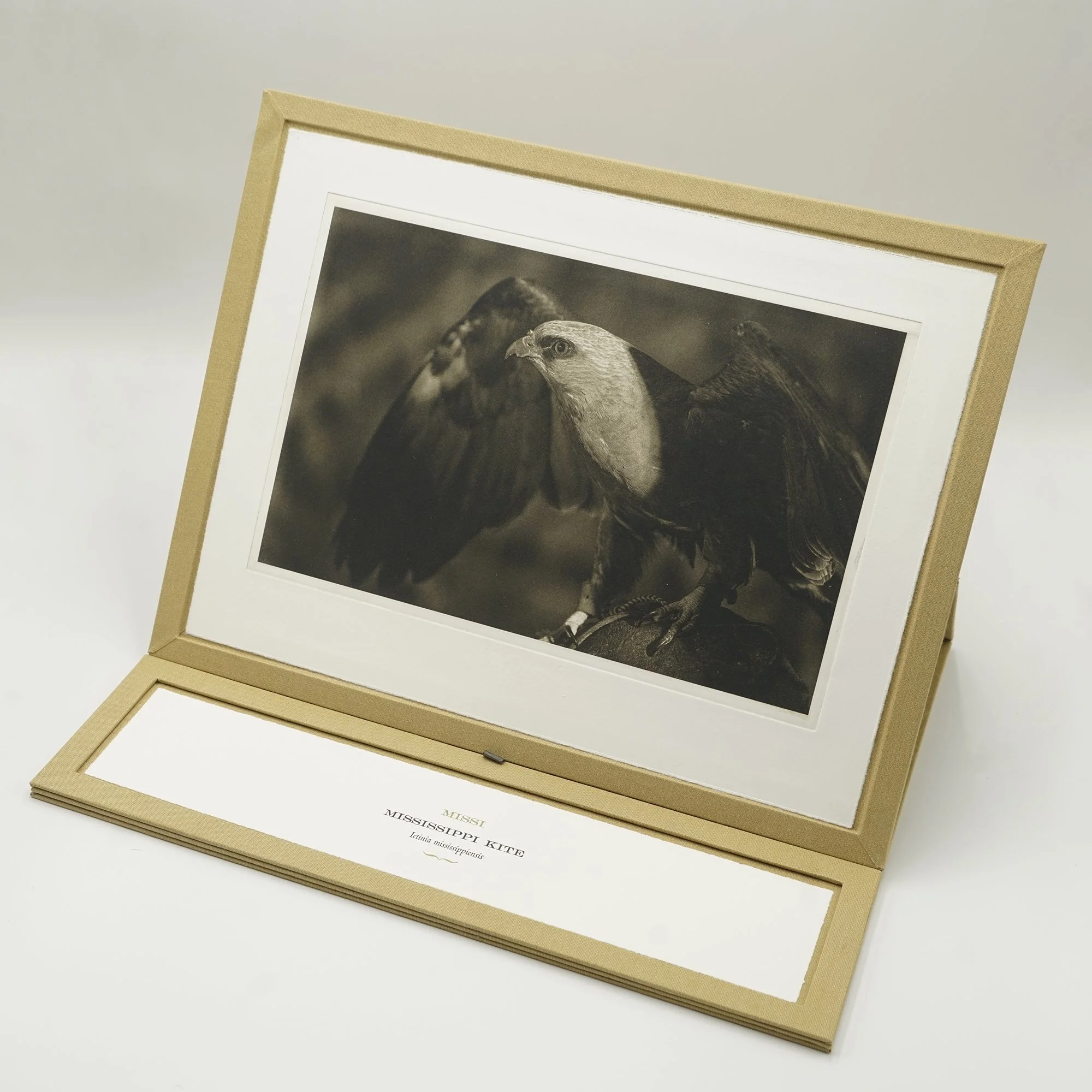 The photographs were taken during a shooting experience of birds of prey that reside at the Blackland Prairie Raptor Center. The project includes three 7x11” Polymer Photogravures on Rives BFK paper. The prints are mounted and presented in a collapsible presentation structure inspired by Sarah Horowitz and Rory Sparks. Each of these are titled with the bird’s name, species common name, and scientific name. These three are then housed in a 3-level slipcase outer structure.